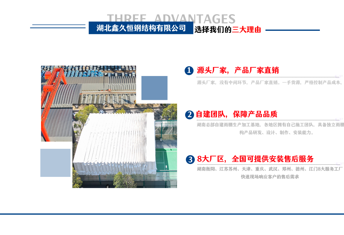 湖北鑫久恒鋼結(jié)構(gòu)有限公司是一家電動雨棚、膜結(jié)構(gòu)車棚研發(fā),生產(chǎn)銷售,施工安裝于一體的專業(yè)鋼結(jié)構(gòu)科技公司,主要產(chǎn)品有伸縮雨棚,電動雨棚,膜結(jié)構(gòu)車棚等。  湖南地區(qū)職員目前有80多人,占地面積20000平方米,廠房面積15600平方米,配備先進的生產(chǎn)流水線,使每件品質(zhì)產(chǎn)品的堅實基礎(chǔ)。  公司在蘇州、天津、重慶、武漢、德州、烏魯木齊、江門均設(shè)有服務(wù)工廠,總?cè)藛T共300多人,擁有專業(yè)的技術(shù)團隊,配備先進的設(shè)備和流水線生產(chǎn),產(chǎn)能高,貨源充足,發(fā)貨速度快,服務(wù)區(qū)域廣。  移動伸縮棚適用于通道臨時倉儲、戶外運動遮陽、污水池遮蓋、能源交通、熱力化工、礦山、船舶制造及市政建設(shè)、物流、碼頭等領(lǐng)域的構(gòu)件制作加工,成品半成品存放、倉庫、野外儀器設(shè)備操作用房等。尤其是對工廠發(fā)貨、倉儲臨時遮雨防嗮,梅雨期較長、建設(shè)周期較短的工程施工等特別適用。還可根據(jù)用戶需求量身定制、適合企業(yè)所需不同款式的產(chǎn)品。  我公司堅持“誠信社會為本,客戶滿意為榮”的經(jīng)營理念,做到質(zhì)量把控,嚴格管理,精益求精,恪守承諾。使鑫久恒逐步走向成熟,其系統(tǒng)化、專業(yè)化日趨完善。以專業(yè)的技術(shù)、科學(xué)的管理,更高的產(chǎn)品質(zhì)量,優(yōu)良的企業(yè)信譽,真誠的客戶服務(wù),靈活多樣的經(jīng)營方式和務(wù)實創(chuàng)新的企業(yè)精神愿與社會各界攜手合作,為推動智能鋼結(jié)構(gòu)建筑事業(yè)的發(fā)展而不斷努力。...